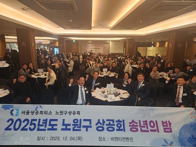 서울상공회의소 노원구상공회(회장 김범수)는 2025년 12월 4일(목) 19:00 ~ 21:00까지 비엔티컨벤션에서 "2025년 노원구상공회 송년회" 를 개최하였다.* 참석내빈 - 오승록 노원구청장 - 손영준 노원구의회...